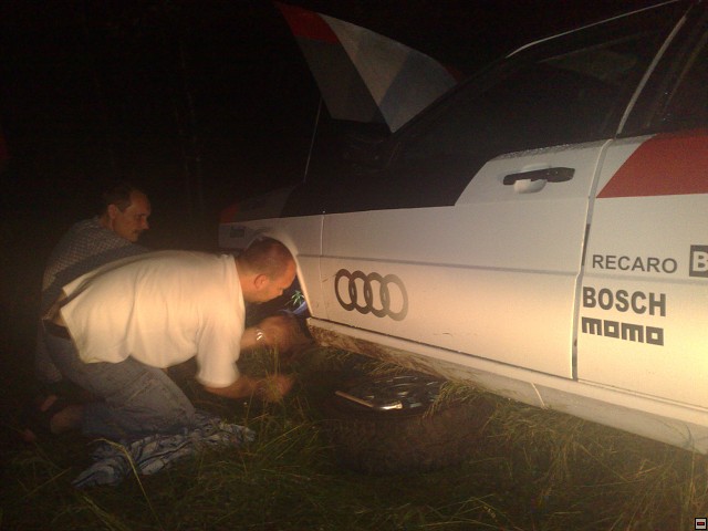 citace: Stig : Byla to rána jak z děla.. naštěstí auto dopadlo na všechna 4 kola...škody jsou minimální...urvaná nádrž..kličky oken,vzpěry kufru..naštstí máme dobře vybavené technické zázemí takže oprava proběhla celkem bez větších problému...Jen ten zkurvenej zelenej hever co žere trávu a svítilnu které svítí kam nemá...Za to klukum Z audi děkujem...Poznamenal Blomqvist